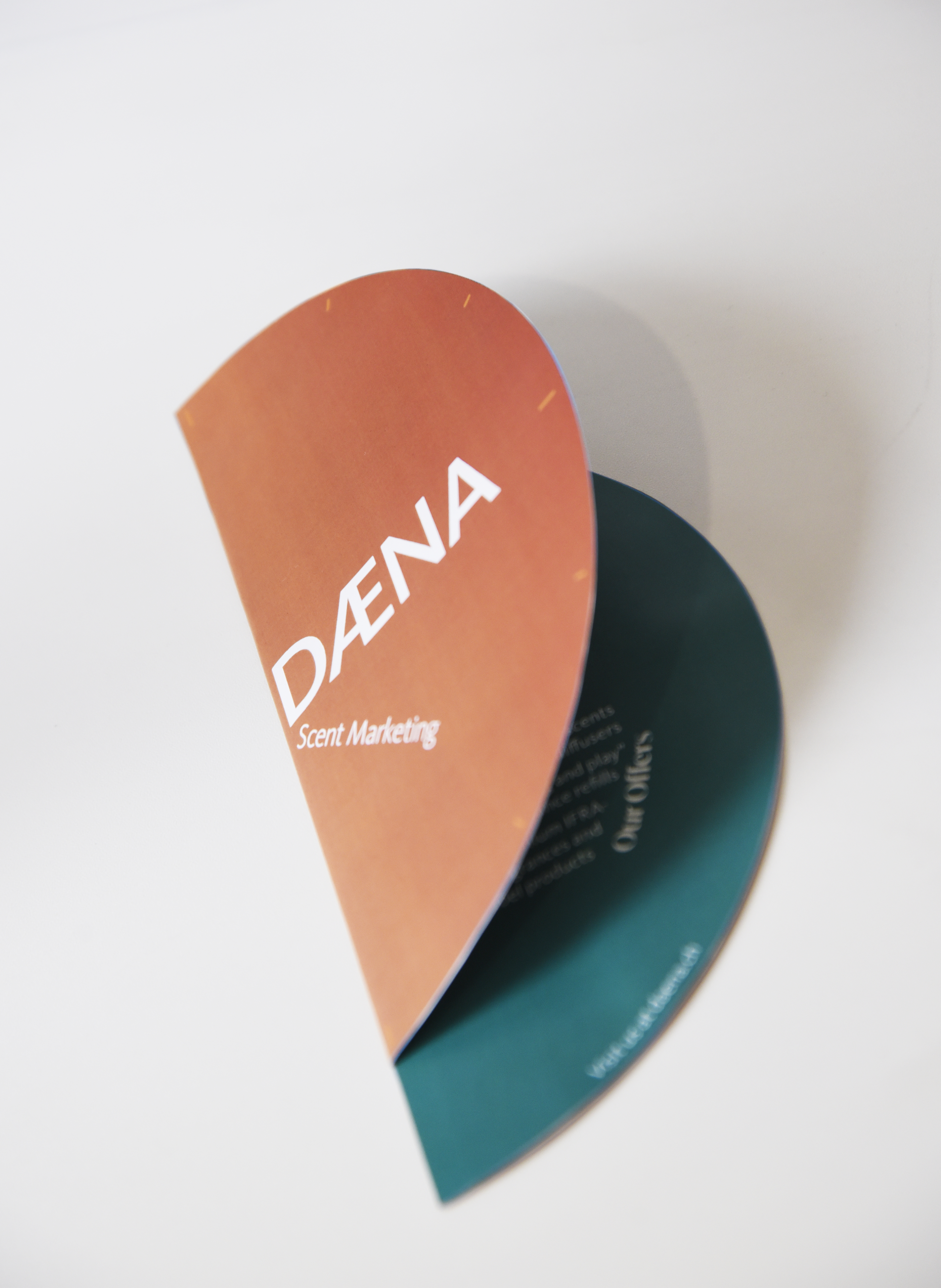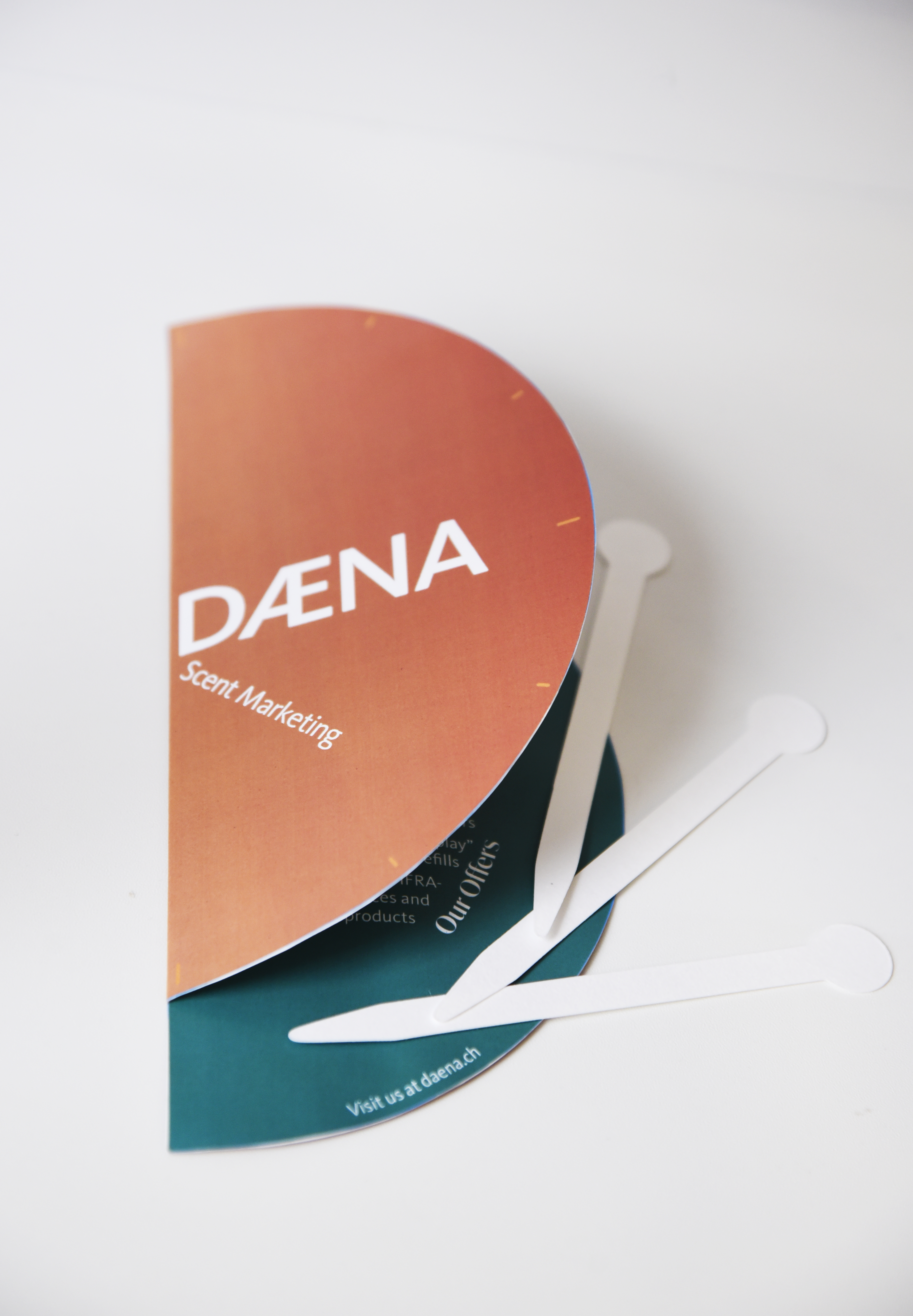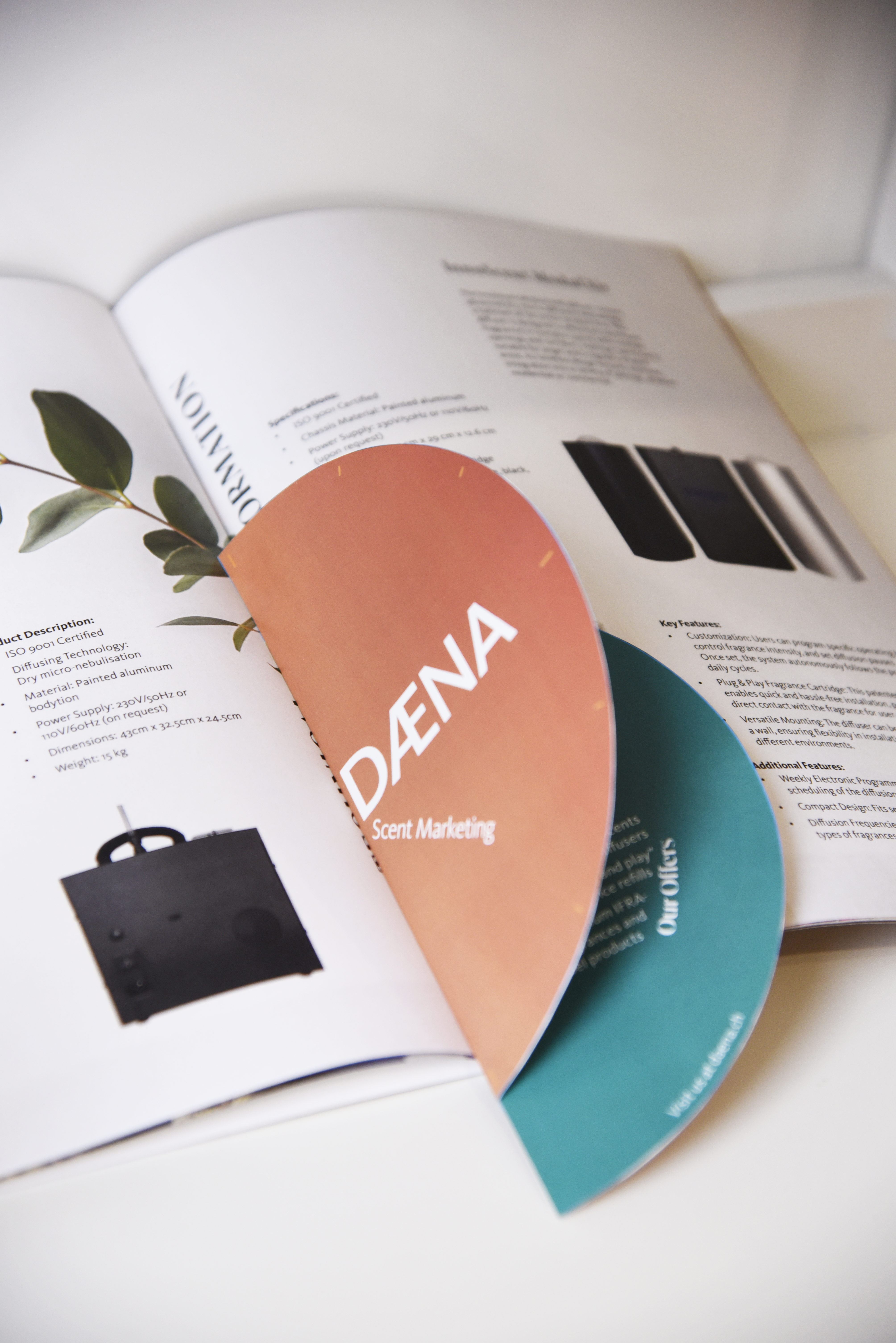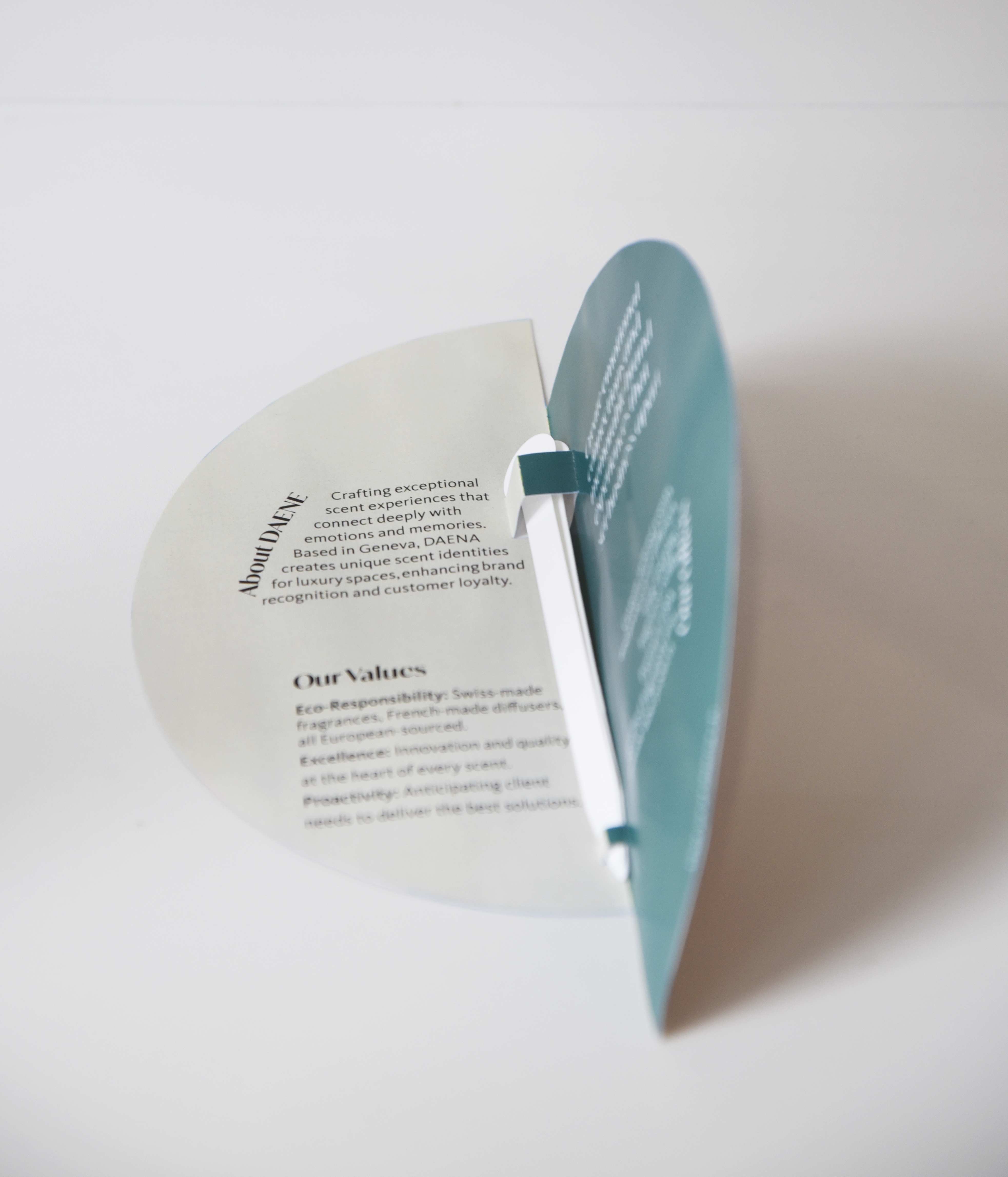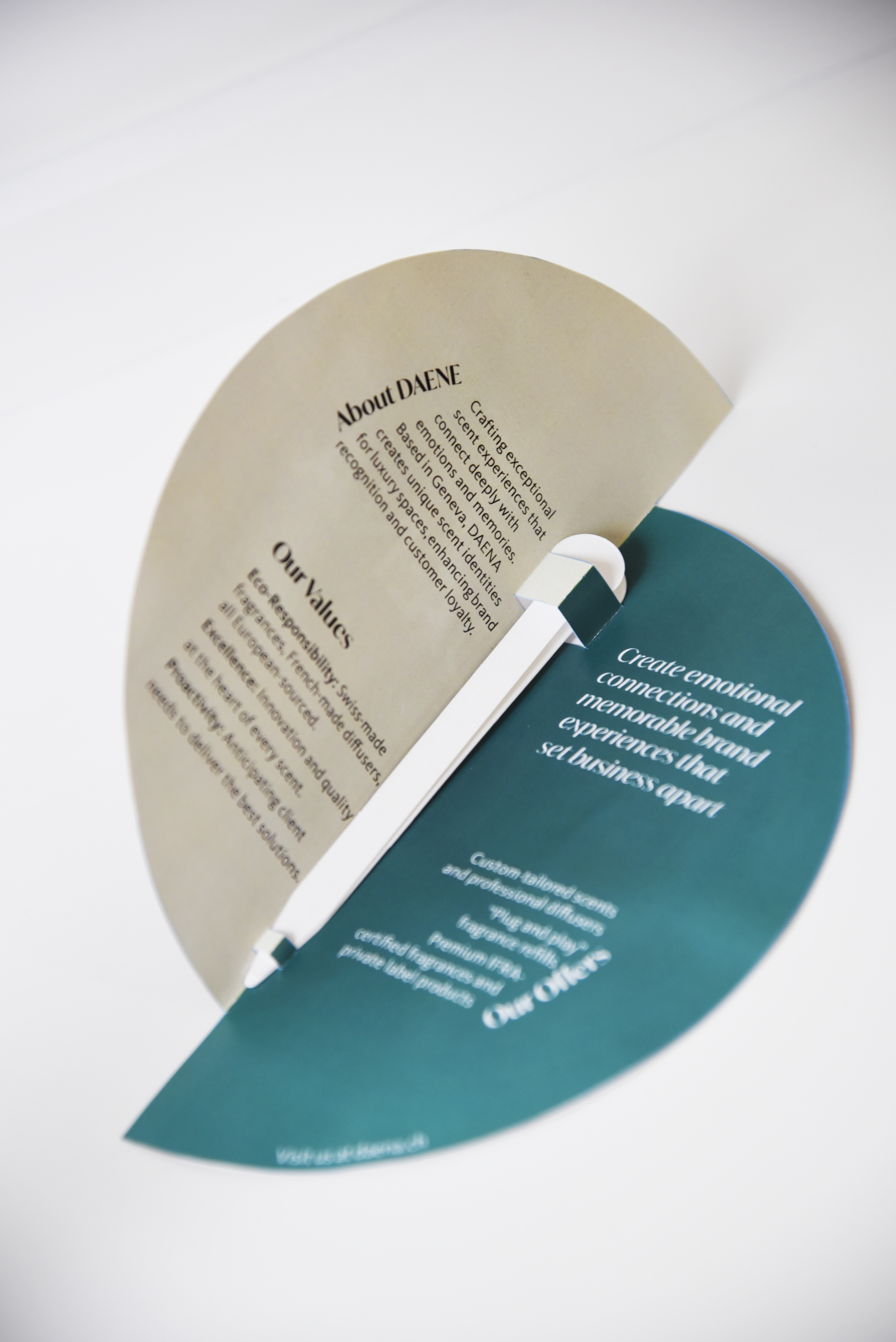 The catalogue features clean layouts, refined typography, and a cohesive color palette, highlighting DAENA’s luxury identity and customizable offerings. The clock-shaped promo card includes built-in scent tester strips, providing an immersive sensory experience and reinforcing the brand’s message of “time-traveling scents that tell your stories.”