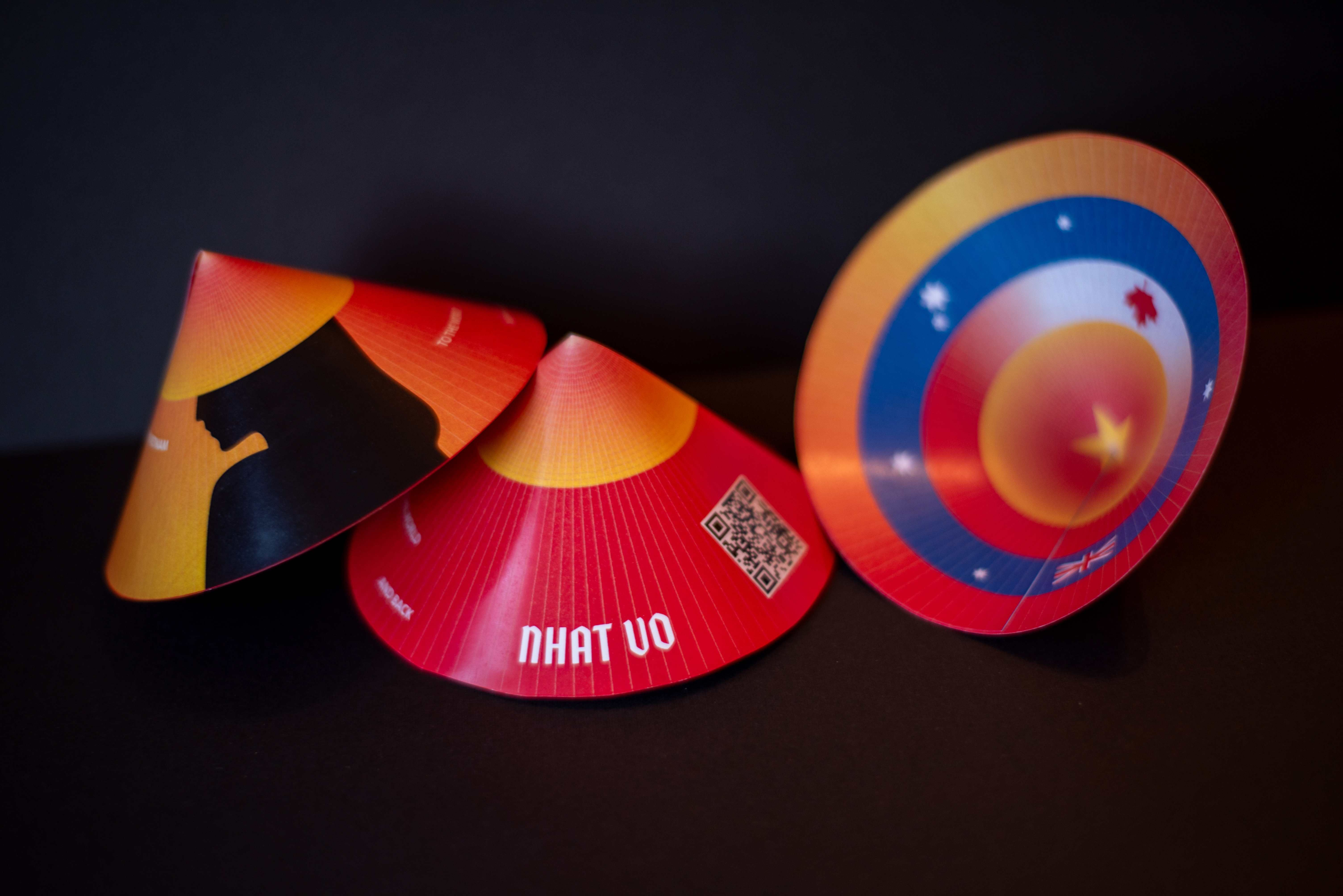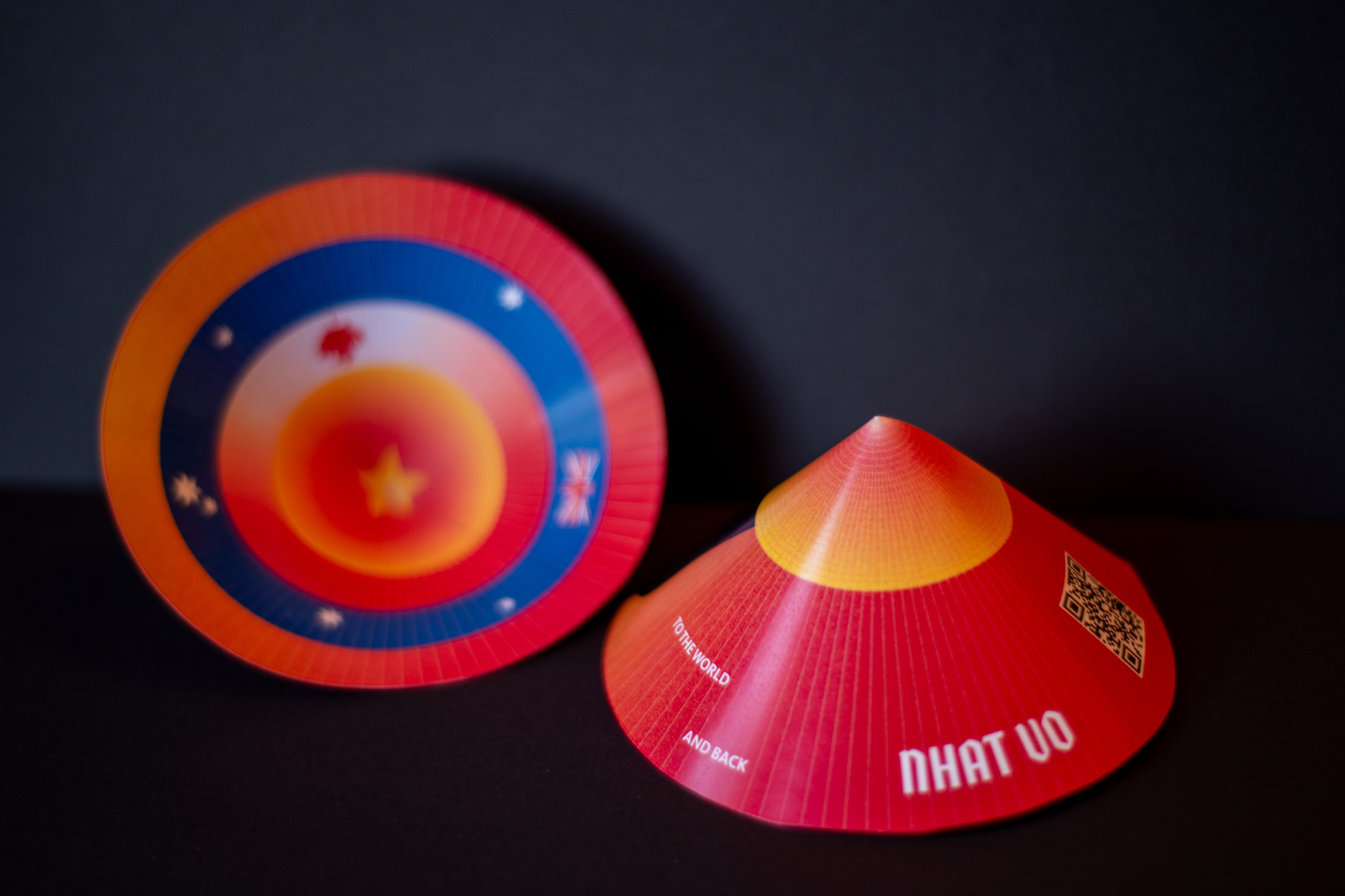 This same nón lá now embodies my personal and professional journey, blending cultures from Vietnam, Australia, and Canada. Each element—from the iconic Vietnamese star to the subtle symbols of the maple leaf and stars—reflects my path of learning, sharing, and returning enriched. Crafted to reflect a blend of tradition and global insights, this conical hat is not merely a symbol of heritage but a narrative of my life lived across continents. Now, with a nón lá in hand, I’m ready to return home, equipped to bridge cultures and contribute rich insights to my roots.